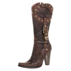 Loriblu Dark Brown Embossed Leather Studded Buckle Knee Boots Size 38.5