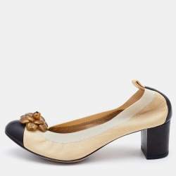 Chanel Beige/Black Leather Bow Cap Toe Pumps Size 40