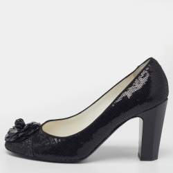 Chanel Black Lace and Suede Interlocking CC Logo Pumps Size 37