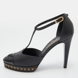 Chanel Black Leather CC Logo T-Strap Pumps Size 36