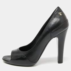 Chanel Black Leather Peep Toe CC Pearl Heel Pumps Size 38.5