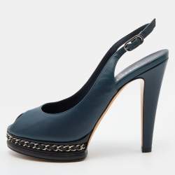 Chanel Black Leather Chain Trim Peep Toe Block Heel Pumps Size 37