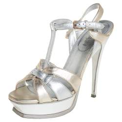 Yves Saint Laurent Metallic Gold/Silver Leather Tribute Platform Sandals Size 37.5