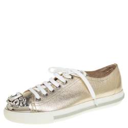 Miu Miu White Textured Leather Crystal Embellished Lace Up Sneakers Size 37