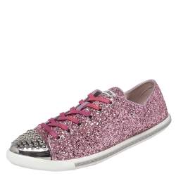 Miu Miu Silver Glitter and Leather Crystal Embellished Sneakers Size 39